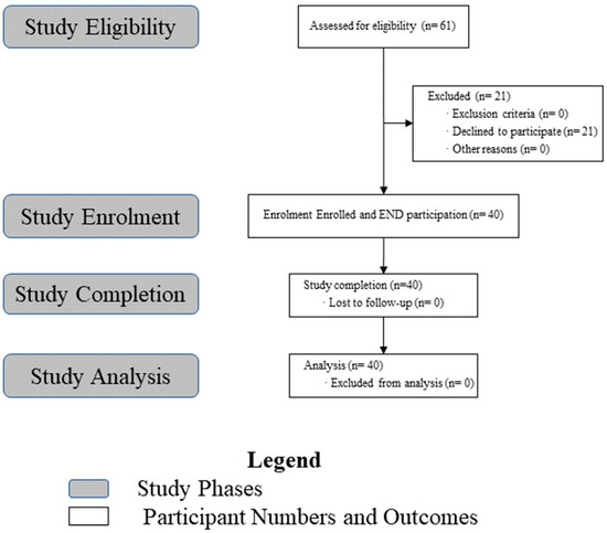 Of 61 applicants, 21 were excluded due to withdrawal or frequent absences, and 40 ultimately completed the program without any dropouts during the study period.