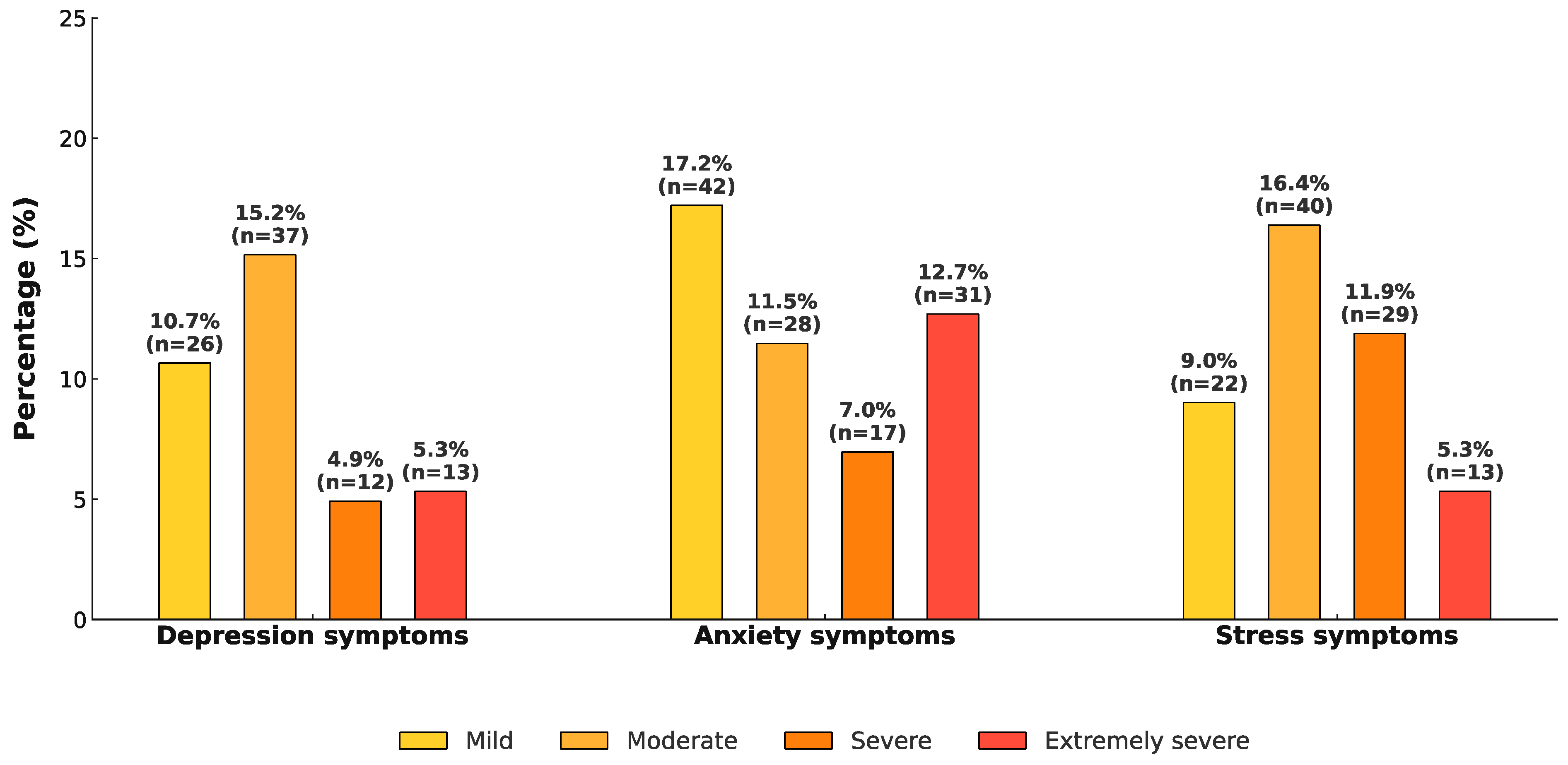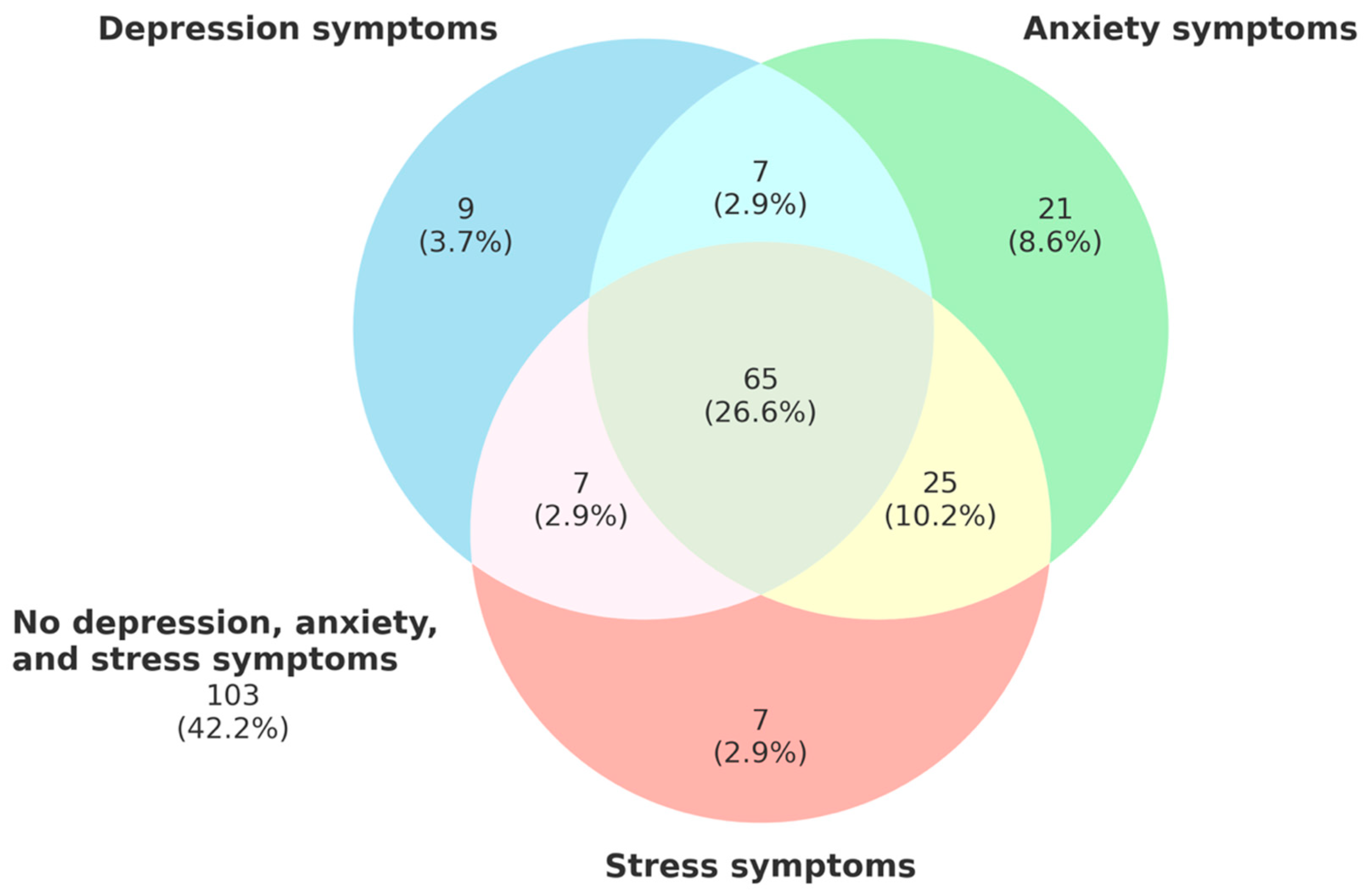Symptoms of depression, anxiety, and stress were reported by 36.1%, 48.4%, and 42.6% of participants, respectively. Among female students, 39.7% (n = 69) reported symptoms of depression, 54.6% (n = 95) symptoms of anxiety, and 50.6% (n = 88) symptoms of stress. In contrast, among male students, symptoms of depression, anxiety, and stress were reported by 27.1% (n = 19), 32.9% (n = 23), and 22.9% (n = 16), respectively. Severe or extremely severe symptom levels were observed in 10.2% of participants for depression, 19.7% for anxiety, and 17.2% for stress. The distribution of symptom severity levels (mild, moderate, severe, and extremely severe) across the three domains is presented in Figure 1. Additionally, 26.6% of participants reported concurrent symptoms of depression, anxiety, and stress, as illustrated in the Venn diagram (Figure 2).