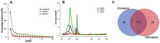 Deep analysis of the cleaned H3K4me2 ChIP-Seq data and KEGG pathways intersection between olanzapine and clozapine. (A) Depth distribution of genome sequencing. (B) Depth distribution of genes and their up and down stream. Rnor_6.0 was selected as the rattus_norvegicus reference genome. The H3K4me2 modification level was calculated by the number of reads per kilobase in the mapped genomic region. (C) KEGG pathways intersection between olanzapine and clozapine. Blue, alone on clozapine; orange, alone on olanzapine; red, interaction between two drugs. Abbreviation: TSS, transcription start site; TES, transcription end site.