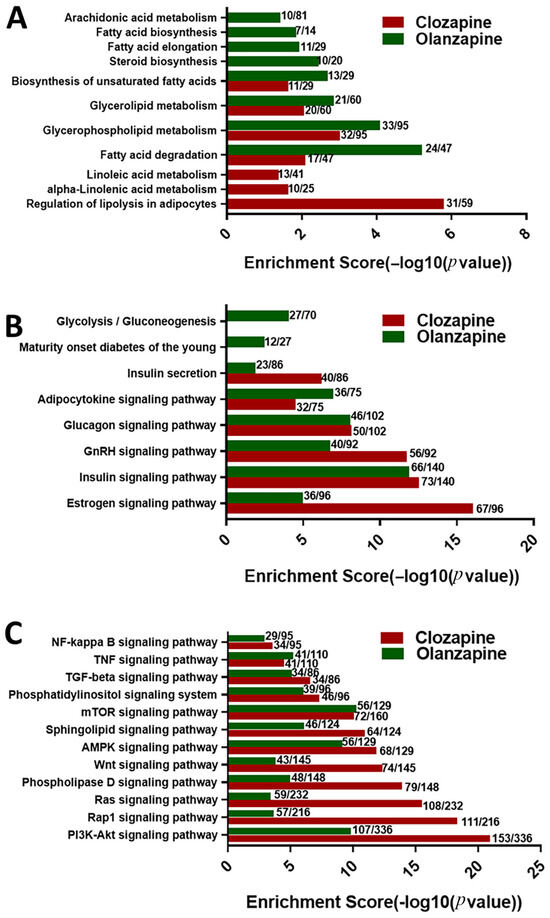 Differential effects of olanzapine and clozapine on H3K4me2-modulated KEGG pathways significantly associated with (A) lipid metabolism, (B) glucose metabolism, and (C) metabolic disorders. The enrichment score is expressed as −log10 (p value), where a higher score indicates greater statistical significance of the pathway.