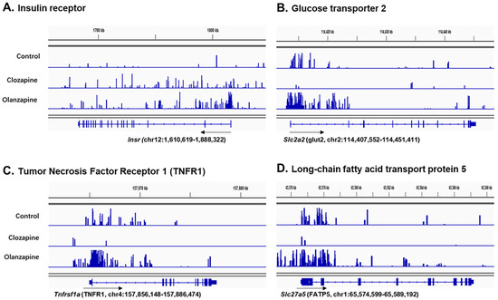 Examples in snapshots of H3K4me2 binding on genes locus of the membrane receptors or transmembrane carrier proteins related to insulin resistance pathways in the liver cell in response to olanzapine and clozapine treatment. (A) Insulin receptor (Insr), (B) glucose transporter 2 (Slc2a2), (C) tumour necrosis factor receptor 1 (Tnfrsf1a), and (D) long-chain fatty acid transport protein 5 (Slc27a5). Black arrows, the directions of gene transcription.