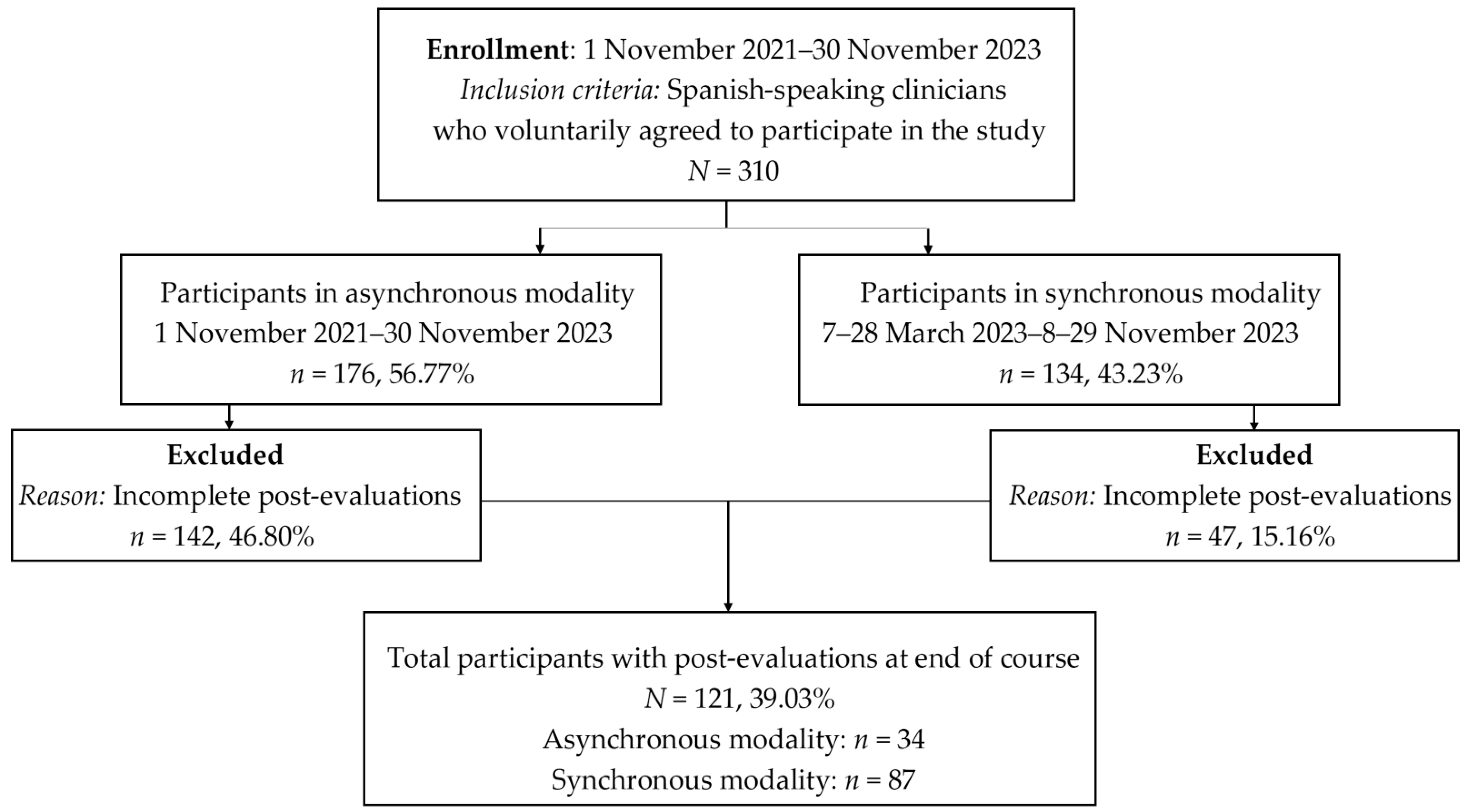 The final sample of participants in both the asynchronous and synchronous courses comprised 310 clinicians from seventeen Spanish-speaking countries, with 176 completing the asynchronous and 134 the synchronous course. A total of 121 clinicians completed post-evaluations (34 in the asynchronous and 87 in the synchronous course. There were no differences between those who completed (