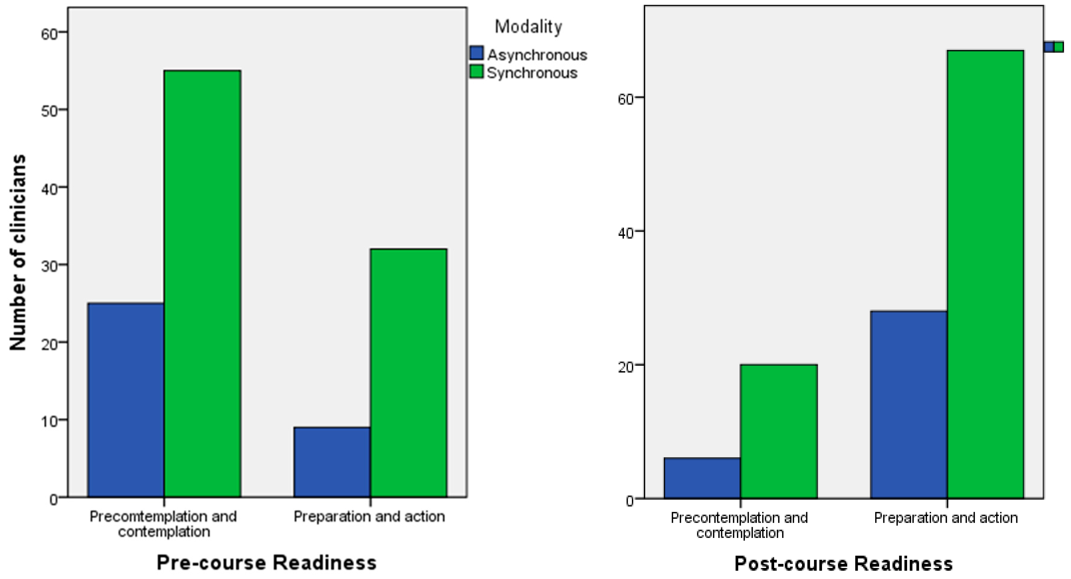 Importantly, after both course modalities, the percentage of clinicians at the preparation and action stages was considerably higher than before the courses (preparation plus action = 82.35% vs. 26.46% in the asynchronous and 77.00% vs. 36.77% in the synchronous modality). Conversely, the number of clinicians at the precontemplation plus contemplation stages was lower (2.94% vs. 73.52% in the asynchronous and 2.29% vs. 63.21% in the synchronous modality) (