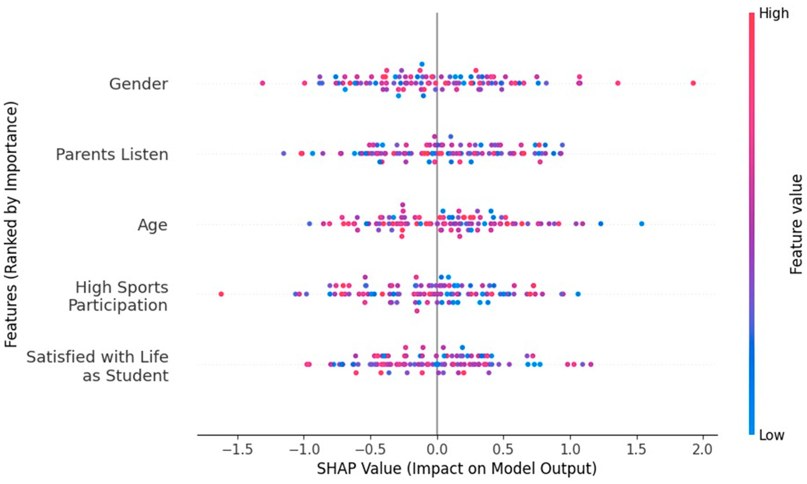 SHAP analysis (Figure 2) illustrated feature contributions to SWB predictions, with satisfied life as student showing the largest spread (high values positively impacting SWB), followed by parents listen and high sports. Age and gender had smaller, mixed effects.