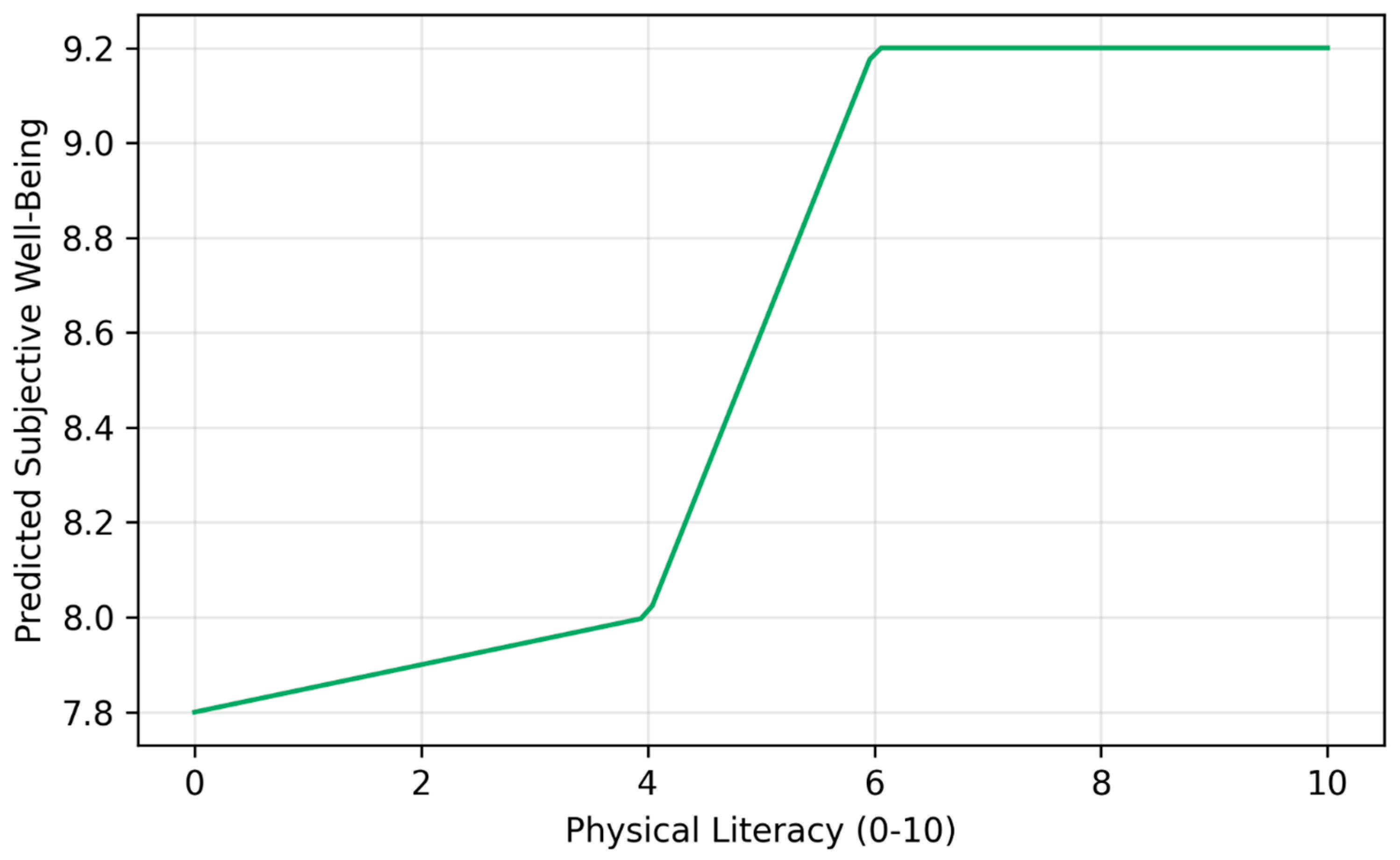 Physical literacy (PL) has gained traction as a holistic concept that encompasses not only physical competence but also the motivation, confidence, knowledge, and understanding necessary for lifelong engagement in physical activity [11,12]. Defined by international consensus as the foundation for active living, PL integrates physical, psychological, social, and cognitive domains, making it a potential mediator in the pathway from sports participation to SWB [13]. For instance, children with higher PL are more likely to enjoy physical activities, leading to sustained participation and positive affective experiences [14]. This aligns with broader health promotion models that emphasize the role of PL in fostering resilience and well-being during critical developmental stages [15]. Despite its promise, empirical investigations into PL’s mediating role are limited, often confined to small-scale studies in single countries, neglecting the non-linear and heterogeneous effects that may vary by age, gender, or cultural context. Recent systematic reviews emphasize that much of the current evidence still relies on cross-sectional designs with reduced samples, overlooking the multidimensional nature of psychological well-being proposed by eudaimonic frameworks such as Ryff’s model. Moreover, findings suggest that factors like self-acceptance, life purpose, and personal growth dimensions closely tied to physical activity may operate differently across populations, yet they remain underexplored in sport-specific contexts [16,17].