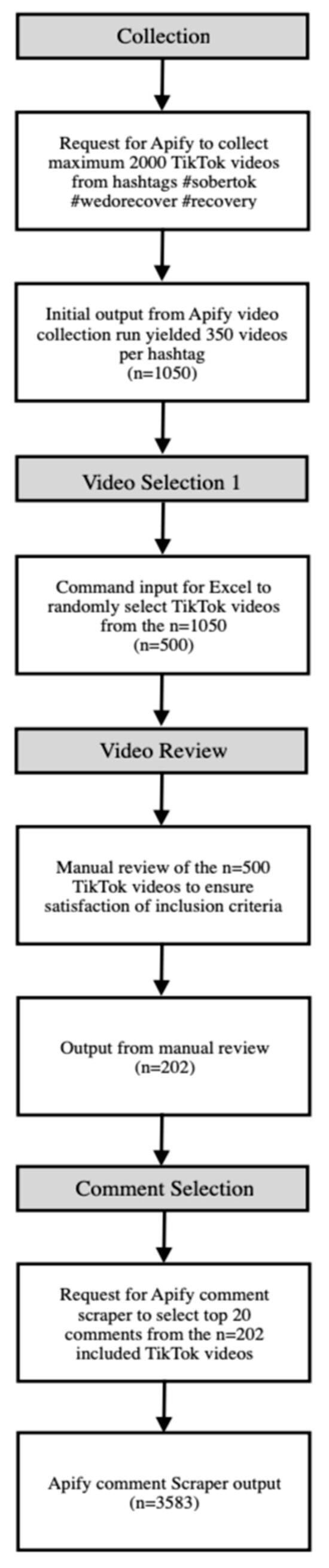 The Apify TikTok scraper tool [19] was first used to collect a random sample of TikTok videos within the search criteria. The request input for the initial video scrape included the hashtags #sobertok, #wedorecover, and #recovery. These hashtags were determined to be the most relevant through a preliminary, informal TikTok search by the researchers. The initial video scrape was conducted on 12 February 2024 and produced 1050 videos, 350 videos per hashtag. The 1050 video URLs collected were then exported into an Excel file, and a shortlist of 500 video URLs was randomly selected from the data pool. The Excel random function was used to assign a number to each URL, and then each URL was subsequently ordered from smallest to largest. The first 500 of these were selected for manual verification. The 500 videos were divided among the three researchers and manually verified to ensure they met the inclusion/exclusion criteria before being selected for the final dataset. The inclusion criteria were as follows: (1) video caption included at least one of the following hashtags: #wedorecover #sobertok #recovery; (2) videos with at least one comment; (3) videos in English; and (4) videos contained an aspect of a substance use recovery journey personal to the speaker, including comparison photos, talking about recovery journey (i.e., vlog style, self-recording), sober curious, videos celebrating number of days sober, comedic interpretations of recovery journey, and songs about recovery journey. The exclusion criteria were: (1) videos not in English; (2) videos with comments turned off; (3) comedic videos not exclusively sharing personal recovery journey; (4) videos on non-substance-related recovery stories; and (5) videos focusing on product advertisements related to substance (e.g., non-alcoholic wine). Two hundred and two chosen videos were then put through an Apify TikTok Comments Scraper [20], where the top 20 comments of each video were scraped on 21 February 2024. In this context, “top” refers to the first 20 comments returned by the scraper, which mirrors TikTok’s default comment display order. This ordering is generally influenced by a combination of factors, including the number of likes and the time of posting, although TikTok’s exact algorithm is not publicly available. This resulted in 3583 comments. See Figure 1 for the data extraction procedure.