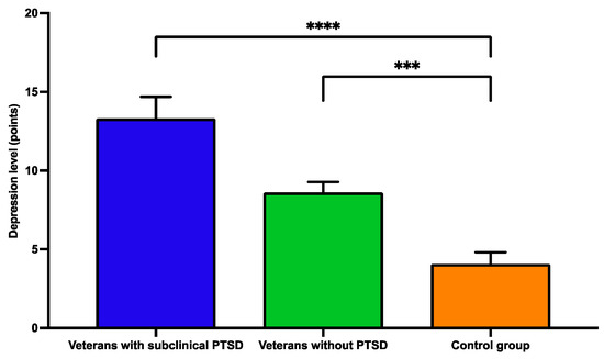 A Comparative Analysis of the Severity of Depressive Symptoms based on the Beck Depression Inventory (BDI) among veterans with subclinical PTSD (blue), without PTSD (green), and the control group (orange). Note: *** p < 0.001, **** p < 0.0001.
