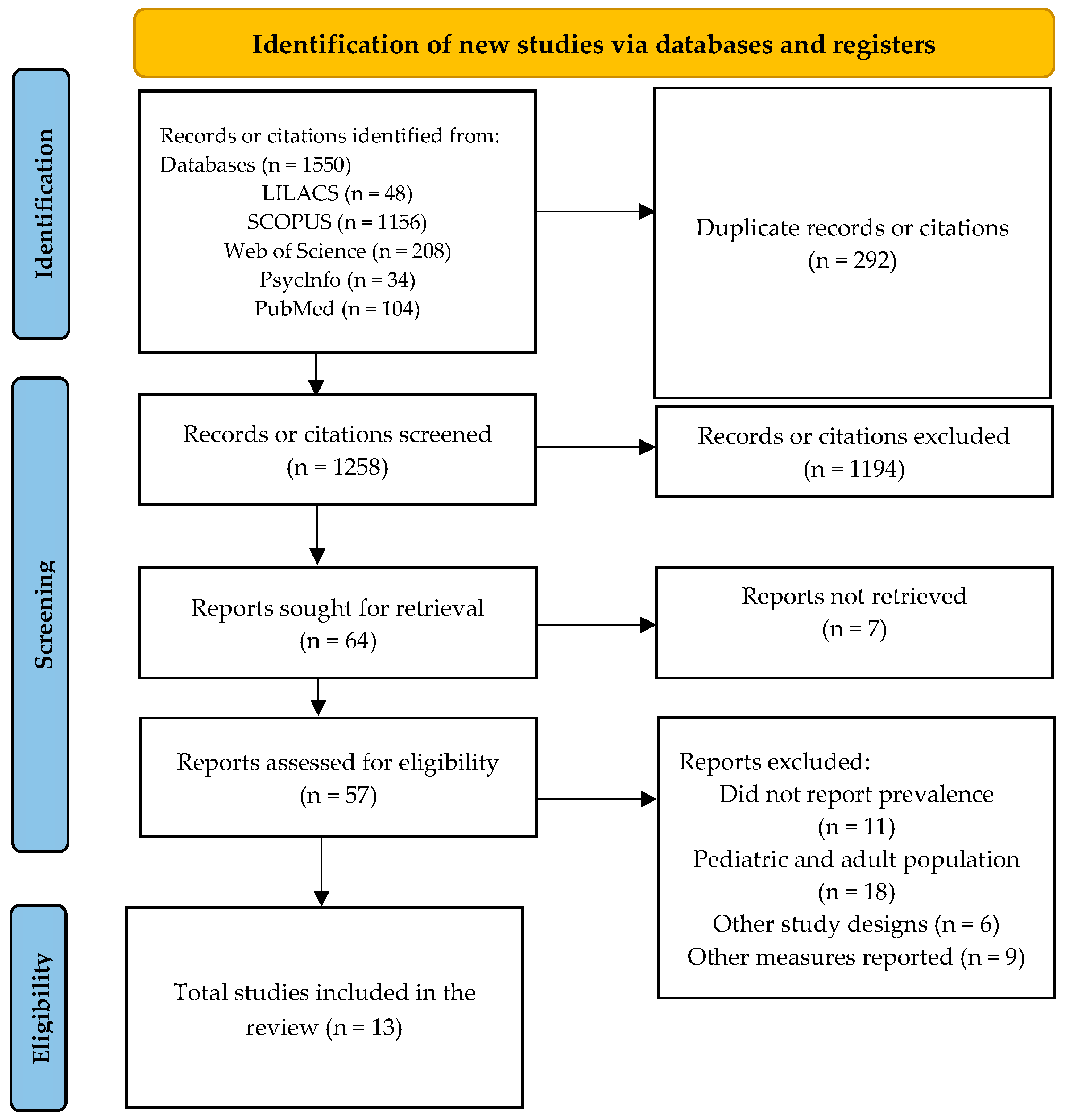 - Munn, Z.; Moola, S.; Lisy, K.; Riitano, D.; Tufanaru, C. Methodological guidance for systematic reviews of observational epidemiological studies reporting prevalence and cumulative incidence data. Int. J. Evid. Based Healthc. 2015, 13, 147–153. [Google Scholar] [CrossRef]