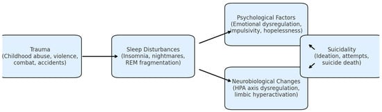 Psychologically, disturbed sleep following trauma can amplify negative affects, hopelessness, and feelings of entrapment [12,13]. Chronic insomnia is associated with attentional bias toward threat, impaired problem-solving ability, and reduced cognitive flexibility—factors that have been directly linked to suicidal behavior [14,15]. Moreover, nightmares may act as nocturnal re-experiencing episodes, reinforcing maladaptive cognitions about the self and the world, and perpetuating emotional distress [16].