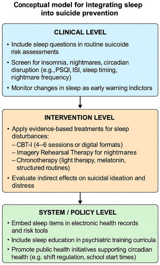 Addressing these barriers requires system-level strategies, such as embedding sleep modules into psychiatric residency curricula, integrating digital CBT-I platforms into outpatient clinics, and including sleep metrics in electronic health record templates for suicide risk assessment. These practical steps transform abstract recommendations into routine practice. Figure 1 provides a concise visual summary of the proposed framework, outlining how sleep-related assessment and interventions can be embedded within suicide prevention efforts at multiple levels of practice.