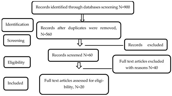 The search process returned 900 records. There were 159 PubMed records, 320 Embase records, 220 Web of Science records, and 201 SCOPUS records. After removing 340 duplicate records and 500 irrelevant records, a total of 60 screened records were found eligible for full-text screening. A total of 40 studies were removed following the full-text screening process, resulting in 20 full text articles moving into the extraction and reliability assessment stage. The elimination of the 40 studies was due to these studies falling in the exclusion criteria. Figure 2 depicts the flow diagram.