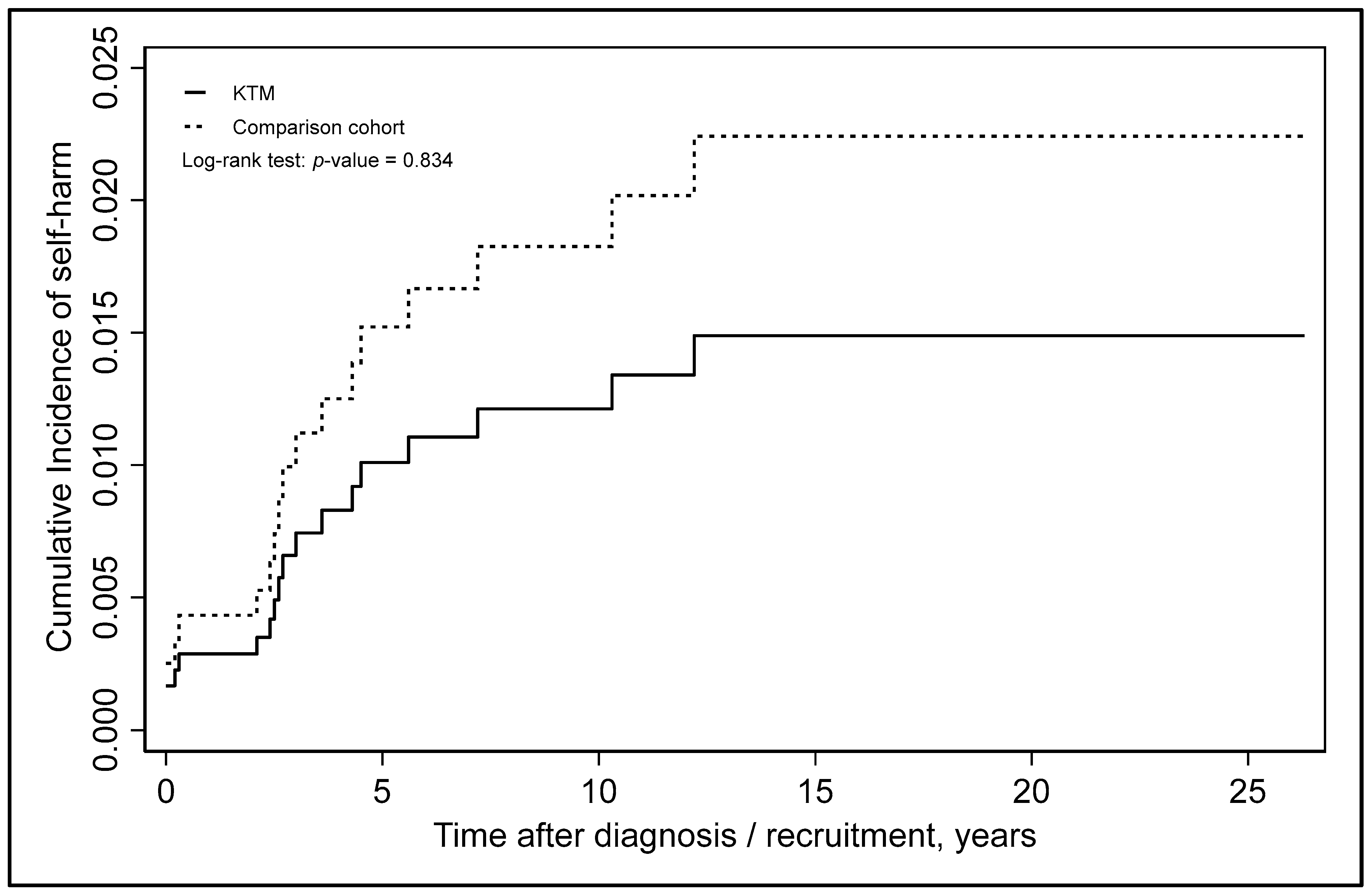 | Average time to self-harm (years) | 4.9 ± 4.0 | 1.8 ± 1.6 | 0.063 b |