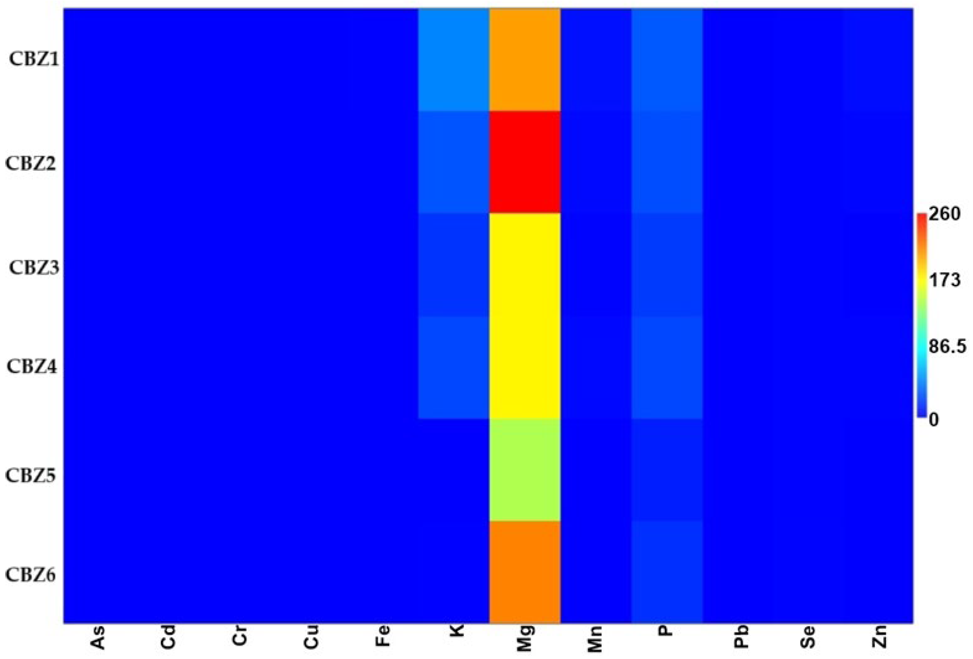- In relation to the element Mg, the decreasing order of concentration values was CBZ2 > CBZ6 > CBZ1 > CBZ4 > CBZ3.