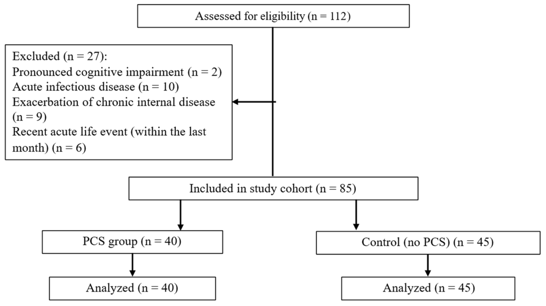 A total of 85 patients who met the inclusion and exclusion criteria were enrolled. Depending on PCS status, participants were divided into two groups: the PCS group (n = 40) and the non-PCS control group (n = 45). Baseline demographic characteristics are presented in
