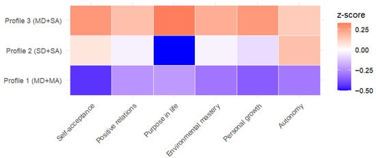 Profile 1 (MD + MA) showed consistently negative z-scores across all Ryff domains, indicating levels below the sample mean. Profile 2 (SD + SA) showed scores largely centered around the sample mean, except for purpose in life, which exhibited a notable negative deviation, whereas Profile 3 (MD + SA) exhibited standardized scores above the sample mean across all Ryff dimensions.