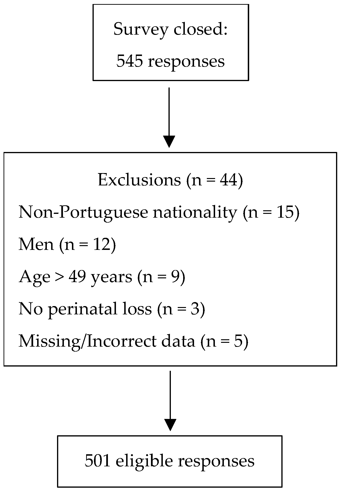 - Mendes, D.C.G.; Fonseca, A.; Cameirão, M.S. The psychological impact of early pregnancy loss in Portugal: Incidence and effect on psychological morbidity. Front. Public Health 2023, 11, 1188060. [Google Scholar] [CrossRef] [PubMed]