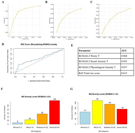ROC curves for RCMAS-2 subscales and BAI Total Score. (A) ROC curve for RCMAS-2 Worry T-score (AUC = 0.968). (B) ROC curve for RCMAS-2 Social Anxiety T-score (AUC = 0.952). (C) ROC curve for RCMAS-2 Physiological Anxiety T-score (AUC = 0.937). (D) ROC curve for BAI total raw score predicting RCMAS-2-defined elevated anxiety (AUC = 0.612, 95% CI 0.5247–0.6993). The solid blue line represents the observed ROC curve, and the diagonal dotted line represents the line of no discrimination (AUC = 0.50). (E) Summary table listing AUC values for all five parameters. (F) Distribution of BAI clinical severity categories among children below the RCMAS-2 clinical threshold (T < 60; n = 755). (G) Distribution of BAI clinical severity categories among children meeting or exceeding the RCMAS-2 clinical threshold (T ≥ 60; n = 129). Revised Children’s Manifest Anxiety Scale, Second Edition (RCMAS-2); Beck Anxiety Inventory (BAI).