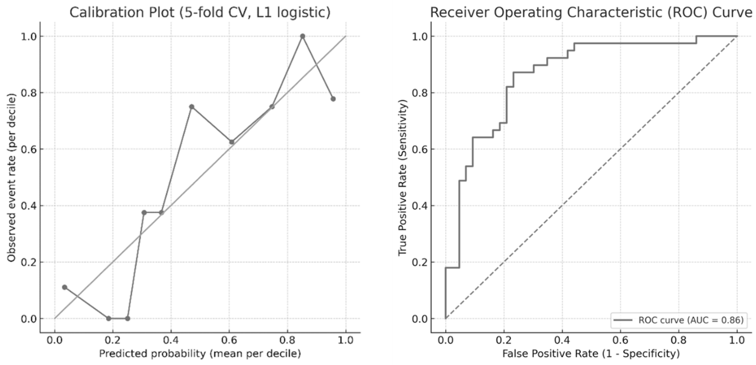 To identify independent predictors of depression status, a multivariate logistic regression approach was implemented. Before modeling, all continuous predictors were imputed by the median and standardized as z-scores to ensure comparability of coefficients and convergence stability. Some Brain Gauge metrics were potentially correlated; thus, a two-stage modeling strategy was adopted: 1. logistic regression with L1-penalization (LASSO) was applied using five-fold stratified cross-validation (solver = Stochastic Average Gradient Augmented or SAGA, penalty = L1, scoring = area under the curve or AUC). The L1 penalty introduces sparsity by shrinking non-informative coefficients toward zero; 2. The optimal penalty parameter (inverse of regularization strength or C) was automatically determined as the one maximizing the cross-validated area under the ROC curve (AUC). Only variables with non-zero coefficients in the final cross-validated model were retained as independent predictors. This procedure simultaneously controls for multicollinearity and overfitting, favoring a parsimonious, data-driven selection of features. The subset of predictors selected in the LASSO step was then refitted in a conventional maximum-likelihood logistic regression. This unpenalized model provides unbiased coefficient estimates suitable for clinical interpretation. Regression coefficients (β) were exponentiated to yield odds ratios (ORs) with 95% confidence intervals (95% CI). Model fit was assessed with the Hosmer–Lemeshow goodness-of-fit test and the Nagelkerke pseudo-R2 statistic. Predictive performance was assessed using a stratified five-fold cross-validation of the penalized model, reporting the AUC, sensitivity, specificity, precision, recall, and F1-score at the Youden-optimal cutoff (maximizing sensitivity + specificity − 1). Calibration of predicted probabilities was assessed by grouping predictions into deciles and plotting observed versus expected event rates. All tests were two-tailed, with α = 0.05. This analytic framework ensures that the resulting model balances discriminative performance, interpretability, and robustness, while transparently documenting the data-driven process by which Brain Gauge metrics were selected as independent predictors of depression status.
