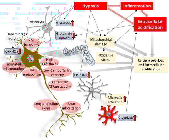 We here summarized evidence that hypoxia, brain acidification and inflammation are involved in the pathogenesis of neurodegenerative diseases and specifically of PD. These factors (apart from neuroinflammation) are still rather considered as consequences or epiphenomena and not as potentially causative factors in disease development. The many failures of clinical trials that have often targeted pathological protein aggregation and oxidative stress, and were considered as more important factors in PD and other neurodegenerative diseases, necessitate the exploration of alternative target pathways and novel therapeutic strategies. We hypothesize that the interplay of hypoxia, brain acidification and inflammation represents a central parameter driving PD pathogenesis. Due to their strong interdependence, the occurrence of any of these events in the brain has the potential to aggravate the others. In the sense of the model proposed by Johnson et al. [117], acute insults from hypoxia, pH dysregulation or inflammation may act to “trigger” neurodegenerative diseases, but may also contribute to a sustained impairment of cell metabolism and biochemistry based on ion homeostasis dysregulation, energy deficiency, oxidative stress and inflammation, thus “aggravating” pathogenesis. These conditions are influenced by different cell types and may be particularly detrimental for dopaminergic neurons of the substantia nigra and other vulnerable neurons in PD, based on their characteristically high energy demands and oxidative stress potential (see Figure 1). These neurons rely on mitochondrial efficiency and an adequate supply of oxygen and nutrients but also on efficient antioxidant defense systems. Hypoxia, pH alterations and inflammation may result in mitochondrial failure (and consequential energy deficits). They can also disrupt vesicular storage of dopamine and related cellular antioxidant defense mechanisms, proteostasis (e.g., by inhibition of autophagy, the proteasome and chaperones) and Ca2+ buffering. Consequently hypoxia, pH alterations and inflammation can initiate neurodegenerative processes.