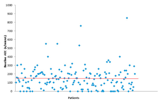 Furthermore, the group with higher AEC was also positively associated with better outcome in terms of objective response rate (ORR) (p = 0.003). ORR percentages are summarized in Table 4.