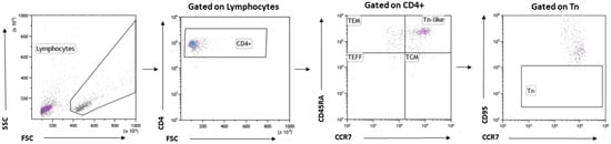 After t48, 106 cells were centrifuged and resuspended with 1ml freezing medium (Bambanker, Nippon Genetics Europe, Dueren, Germany), and frozen at −80 °C for further analysis. To analyze T cell subsets, cells were thawed and prepared for evaluation by flow cytometry. Phenotyping included a live/dead-staining using Zombie aqua and measurement of purity of CD4+ cells (CD4+/alive of all lymphocytes). Briefly, cells were stained with monoclonal antibodies (all anti-human) for T cell subsets, 20% of the cells remained unstained, and 20% were stained as fluorescence minus CD95 of T cell subsets. Antibodies and vendors used are listed in Table 2. 10,000 events were acquired by 488 nm, 638 nm, and 408 nm lasers (Cytoflex, Beckman Coulter, Germany). To identify T cell subsets, naïve (CD4+/alive/CD45RA+/CCR7+/CD95−), central memory (CD4+/alive/CD45RA−/CCR7+/CD95+), effector memory (CD4+/alive/CD45RA−/CCR7−/CD95+), and stem memory T cells (CD4+/alive/CD45RA+/CCR7+/CD95+) CD4+ T cells were gated and proportions quantified using the Kaluza software (Beckman Coulter, Krefeld, Germany). A fluorescence minus one for CD95 was used to increase accuracy for gaiting naïve and stem memory T cells. We followed the flow cytometry guidelines of Mousset et al. for T cell subset differentiation [30]. The gating strategy is shown in Figure 1. The antibodies used are listed in Table 2.