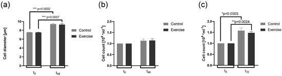 Effects of control and exercise serum on cell parameters. Cell diameter at the beginning (t0) and after 48 h cell culture (t48, a, n = 7) from cohort 2, cell count at t0 and t48, (b, n = 7), and cell count at t0 and 72 h after cell culture from cohort 1 (t72, c, n = 5) are shown with mean and ± SEM. We used one-way ANOVA with Geisser–Greenhouse correction followed by Bonferroni’s post hoc; * p < 0.5, ** p < 0.01, *** p < 0.001). ANOVA: analysis of the variance.