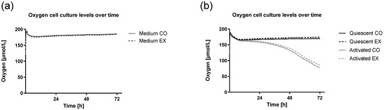 We found no significant difference between CO and EX cell culture conditions 24 h, 48 h, or 72 h after activation with regard to oxygen consumption independent of the culture condition (Figure 5). Over time, the oxygen level of culture with quiescent CD4+ T cells remained stable. Shortly after activation, oxygen levels were continuously reduced.