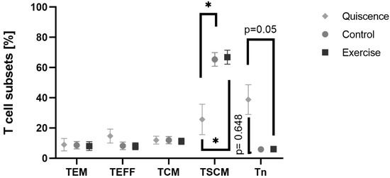 Percentage change in T effector memory cells, T effector cells, T central memory cells, stem cell-like memory T cells, and naive T cells with SEM before activation, at quiescence, and after activation at control and exercise condition. Human CD4+ T cells from cohort 2 were activated in serum before exercise (CO) or after exercise (EX) with anti-CD3/anti-CD28. Quiescent cells remained non-activated. Data are shown with mean ± SEM (Control N = 6, Exercise N = 6, Quiescence N = 4). Significance was determined by Mixed-effect analysis and Tukey’s multiple comparisons. * p < 0.05. TEM: T effector memory cells, TEFF: T effector cells, TCM: T central memory cells, TSCM: stem cell-like memory T cells (TSCM), Tn: naive T cells.