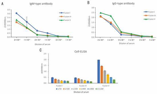 Determination of the isotype and titer of antibodies after DNA and cell immunization. (A) IgM-type and (B) IgG-type antibodies in serum were determined by the ELISA method after mice were sensitized by DNA and cell immunization according to the protocols in Fusions I, III, and V. (C) Specific binding of antibodies in serum to intact huCRHR1 on CHO cells was quantified by the Cell-ELISA method after DNA and cell immunization based on the sensitizing methods of Fusions I, III, and V. Results are shown as the mean ± standard deviation (n = 2). Some error bars are hidden behind each symbol due to the small standard deviation values.