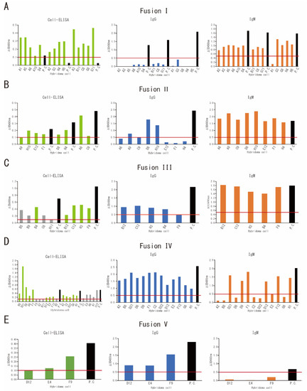 Determination of isotype and specific affinity of monoclonal antibodies generated by the optimized SST technique. Three mice per group were sensitized by DNA and cell immunization at one time. One of the sensitized mice was used for each experiment. (A–E) Five different immunization protocols (Fusions I to V) were used for sensitizing B lymphocytes. The specific affinity of monoclonal antibodies (left panel) in supernatant of hybridoma cells was evaluated by the Cell-ELISA method by means of huCRHR1-expressing CHO cells as an antigen. Monoclonal antibodies in hybridoma supernatant determined by both Cell-ELISA and ELISA methods are shown in green, whereas those measured by only the Cell-ELISA method are in gray in (C,D) (left panel). IgG (middle panel) and IgM (right panel) isotypes of monoclonal antibodies in hybridoma supernatant were quantified by the ELISA method as described in the Materials and Methods. Mouse serum diluted 1/100—(left panel), 1/200—(left panel) or 1/2000—fold (middle and right panels) obtained by DNA and cell immunization in Fusions I to V was used as a primary antibody for the positive control (P.C.), where 1/100—and 1/200—fold diluted mouse sera were used in Fusions I to III and Fusions IV and V, respectively. ΔOD values at 490 nm for (A–E) are shown in Table S1.