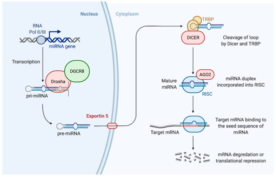 The first miRNA was discovered in 1993 as a critical regulator of developmental timing events in the nematode Caenorhabditis elegans [10]. Since then, over 2000 mature miRNAs have been identified in humans [11]. The mechanisms of miRNA biogenesis and miRNA-mediated gene regulation have been described in recent excellent reviews [5,12]; therefore, we will only briefly overview these mechanisms (Figure 1). miRNA genes located throughout the genome are first transcribed by RNA polymerase II or III to produce primary transcripts (pri-miRNAs). Pri-miRNAs are processed into precursor miRNAs (pre-miRNAs) in the nucleus via the actions of the microprocessor complex, consisting of the RNase III enzyme Drosha and the protein DiGeorge syndrome critical region 8 (DGCR8). Pre-miRNAs are exported to the cytoplasm by exportin 5 and further processed by the RNAse III enzyme Dicer and TAR RNA binding protein (TRBP) to produce mature miRNAs. The mature miRNA provides 5p and 3p strands, which are derived from the 5′ and 3′ arms of the pre-miRNA hairpin, respectively. One strand is loaded into the RNA-induced silencing complexes (RISCs) with Argonaute (AGO) protein and silences target mRNA expression through mRNA cleavage, translational repression, or de-adenylation. This gene silencing process requires a complementary sequence in the 3′-untranslated region (3′-UTRs) of the target mRNA that can bind to the “seed” sequence (2–8 nt at the 5′-end) of miRNA. Although the effect of each miRNA is generally subtle, one miRNA can target hundreds of mRNAs, and multiple miRNAs cooperatively regulate the same gene [12]. This combinational targeting strategy of miRNAs enables them to regulate important cellular processes, including cell proliferation, apoptosis, differentiation, and signal transduction. These cellular changes and subsequent environmental changes can, in turn, regulate miRNA expression at multiple steps of biogenesis [7].