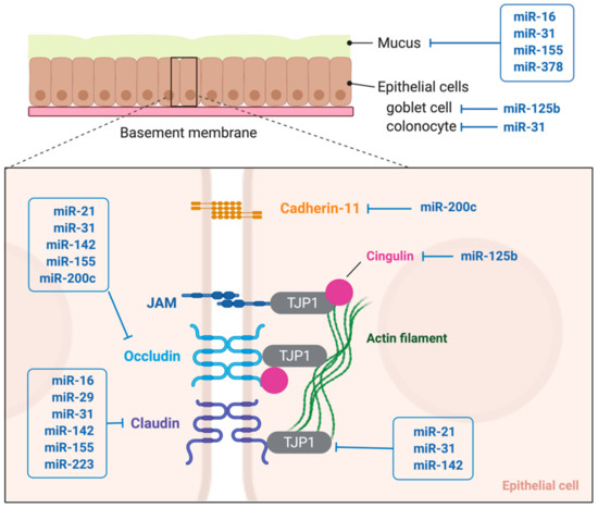 The cell-to-cell junction between IECs is maintained by tight junction proteins (TJPs) and provides physical protection against invading luminal antigens. The altered expression of TJPs, such as a decreased expression of barrier-forming claudins and occludin and an increased expression of pore-forming claudin-2, has been reported in the colonic mucosa of patients with UC [49] and is implicated in increased paracellular permeability in symptomatic patients with UC [50,51]. In contrast to the breakdown of the mucus barrier, increased intestinal epithelial permeability is not accompanied by spontaneous colitis in genetically modulated mice with impaired TJP expression [52,53]. This suggests that the “leakiness” of the IEC monolayer alone may be insufficient for the onset of UC. A variety of miRNAs overexpressed in UC, such as miR-21, miR-31 [54], miR-142 [32], miR-155 [55], and miR-223 [56] are involved in the regulation of TJPs [57] (Table S1). MiR-21 downregulates the expression of tight junction protein 1 (TJP1) and occludin and increases epithelial permeability in vitro [24]. Increased miR-31-5p targets activin A receptor like type 1 (ACVRL1) and may indirectly reduce the expression of TJP1 and occludin by inhibiting colonocyte differentiation through ACVRL1 and bone morphogenetic protein-9 (BMP9) interactions [58]. Enhanced epithelial permeability in BMP9-stimulated human colonic IECs [58] implies that the overexpression of miR-31-5p may contribute to the breakdown of the epithelial barrier in UC. MiR-142-5p directly targets and suppresses the expression of claudin-1 and increases the permeability of the thyroid monolayer in vitro [59]. In addition, miR-142-5p potentially targets transcripts encoding other TJPs, including claudin-8, occludin, and TJP1 [57]. Similarly, miR-155-5p targets the transcript of claudin-1 and potentially targets claudin-8 and occludin [60]. Interleukin (IL)-23-induced miR-223 increases epithelial permeability in colonic epithelial cells, at least in part, by directly targeting claudin-8 [56]. Collectively, these data suggest that UC-associated miRNAs have a detrimental effect on the maintenance of epithelial barrier integrity and the development of colitis (Figure 2).