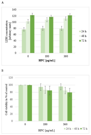 Cytotoxic effects of HPC were evaluated in the first phase of this study in cells from the mouse fibroblast cell line 3T3. Figure 2 depicts the results of LDH release (A) and MTT assay (B) at 24, 48, and 72 h of incubation time with 0, 180, and 360 μg of HPC/mL. Compared to untreated control cells, no significant change in LDH-release was found whether as a function of increasing the HPC concentration or as a function of increasing the incubation period. Treatment with Triton X-100 as positive control increased the LDH release by 430 ± 27% compared to untreated cells (data not shown).