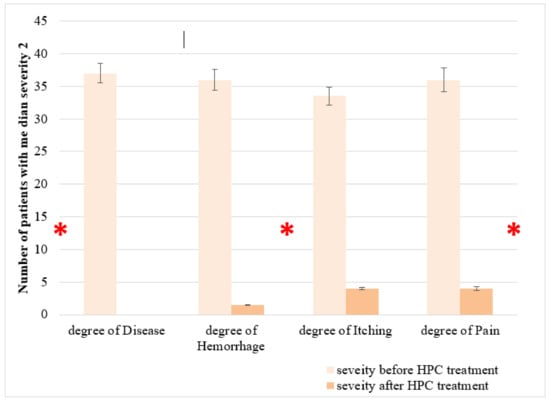 After obtaining the above-discussed positive in vitro results, we tested the safety and efficacy of HPC in the treatment of HD in an open-label, non-randomized, uncontrolled clinical study. This clinical study was carried out on 37 patients (17 females and 20 males, ages 19–59). The patients were asked to apply HPC twice daily for one week. Improvements in the severity degree of hemorrhoids (1–4), hemorrhage (0–3), pain (0–10), and itching (0–3) served us for evaluation of the HPC efficacy. The hemorrhoid severity degree for all the 37 patients was diagnosed as follows: 10 patients with degree 1, 18 with degree 2, and 9 with degree 3. Figure 6 shows the obtained results. Almost all patients experienced a pronounced improvement in all four parameters tested.