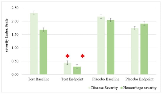 Figure 9 shows the effect of HPC on hemorrhage severity, disease degrees 1–3, as compared to placebo. Improvement was especially evident for the symptom of hemorrhage and no noticeable side effects were observed. Compared to placebo, treatment with HPC reduced the hemorrhage severity index to 0–1 after 6 days. The mechanism may be related to the regulation of cytokines in the systemic and hemorrhoidal region, which increases the permeability of the blood vessels and improves the coagulation mechanism and lymphatic blood pressure [30,34]. As discussed above, there are many reports about the anti-inflammatory action of the three plants of HPC. Several immunomodulatory, anti-inflammatory, and immunotherapeutic effects of NS and AV have been published. These publications provide clear evidence that both crude extracts and its active compounds, in particular thymoquinone, exhibit significant anti-oxidant and anti-inflammatory effects through enhancing the oxidant scavenger system, decreasing the production levels of pro-inflammatory cytokines (e.g., IL-6 and TNF-α) and increasing the production of anti-inflammatory cytokines (e.g., IL-10). Furthermore, NS-derived oil and thymoquinone have also shown potent anti-inflammatory effects in several inflammation-based models including experimental encephalomyelitis, colitis, peritonitis, oedama, and arthritis through suppression of the pro-inflammatory mediators prostaglandins and leukotrienes. Most importantly, both the oil and its active ingredients expressed antimicrobial properties toward different microbes [7,10,11]. AV is used in traditional medicine for different indications, including minimizing the symptoms of sore throat, stopping bleeding, acting against gastrointestinal diseases and inflammatory processes, as well as for promoting wound healing due to its strong antimicrobial and anti-inflammatory effects. Therefore, synergistic anti-oxidant, anti-inflammatory, and antibacterial properties of the three plants of HPC seem to be the main mediators of the observed significant hemorrhage effects of HPC.