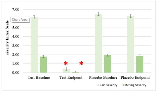 Following up the results obtained by the open-label clinical study on 37 patients (17 females and 20 males, ages 19–59), we conducted a new wider RDBPC to determine the anti-hemorrhoidal efficacy and safety of HPC. The results showed that after 7 days of treatment with HPC, an improvement was observed in all patients during various time intervals in the treatment. There were improvements in the severity of the patients’ major symptoms—severity of hemorrhoids (Degree 1–3) and hemorrhage severity (1–3)—compared to the placebo group (Figure 7). A significant effect of HPC was observed on Quality of life (QoL) of the patients (Degree 1–3), Pain (0–10 Scale), and Itching (0–3 Scale), compared to placebo (Figure 8). No side any effects were reported by any of the patients.