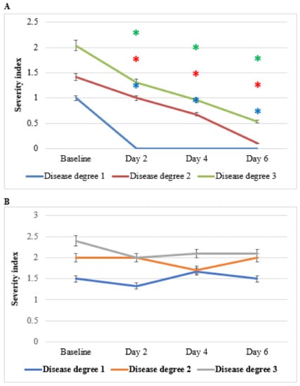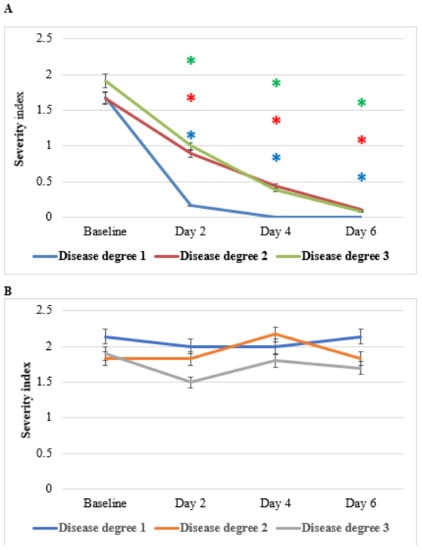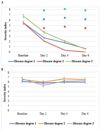 Figure 10 shows the effect of HPC on pain severity, degrees 1–3, as compared to placebo. Patients of all three levels of disease showed significant decreases in the severity of pain, reaching the highest effects (severity index of about 1 in the three severity degrees) on day 6 compared to placebo. Greco-Arab and Islamic herbal medicine use many medicinal plants in the management of pain. Among these plants, AV and NS seeds are the sources of phytochemicals that have been researched for their therapeutic potential [35,36,37,38,39]. NS fixed oil, either topically or orally, is traditionally used for the management of pain in the back, joints, and musculoskeletal organs, as well as for rheumatoid arthritis. The observed anti-pain effects of HPC may be the results of a syncretic effect of all the plants of HPC.