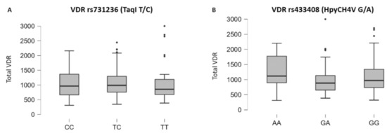 3.1. VDR rs731236 (TaqI T/C) and VDR rs433408 (HpyCH4V G/A) Polymorphisms