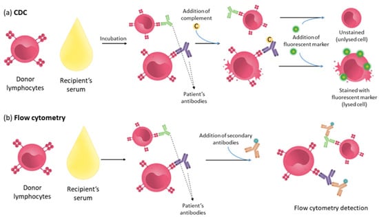 Assays detecting anti-HLA antibodies. (a) CDC: Recipient’s serum is incubated with donor’s lymphocytes; after this, the incubation complement is added, triggering cell lysis on cells bound to complement-binding antibodies. Detection is made using a fluorescent marker that stains lysed cells. (b) Flow cytometry: Recipient’s serum is incubated with donor’s lymphocytes. In this assay, after this incubation, secondary antibodies fluorescently labelled are added to samples to detect cells with the patient’s antibodies bound.