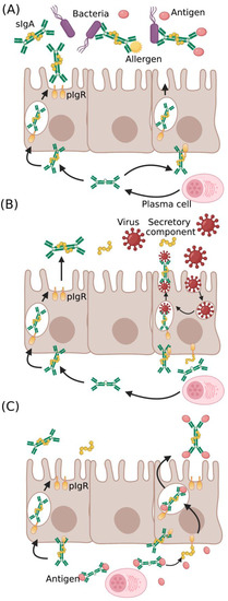 - Turula, H.; Wobus, C.E. The Role of the Polymeric Immunoglobulin Receptor and Secretory Immunoglobulins during Mucosal Infection and Immunity. Viruses 2018, 10, 237. [Google Scholar] [CrossRef]