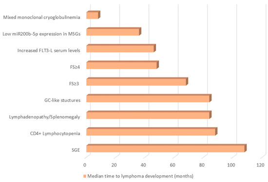 Certain predisposing factors could be detected a long time before lymphoma development (Figure 2). The reported median time from the expression of a feature to lymphoma development could lead to the monitoring of pSS patients. Specifically, the median time to lymphoma diagnosis has been documented to be 108 months for SGE [38], 88 months for CD4+ lymphocytopenia [6], 84 months for lymphadenopathy/splenomegaly [38], 84 months for histologically detected GC-like structures [54], 68 months for an FS ≥ 3 [64], 48 months for an FS ≥ 4 [65], and 8 months for mixed monoclonal cryoglobulinemia [49]. Among the more recently proposed biomarkers, serum Flt-3L levels have been found to increase at a median time of 46 months before lymphoma diagnosis, [124], and low miR200p-5b expression in SGs can be detected at a median time of 36 months before lymphoma [110].