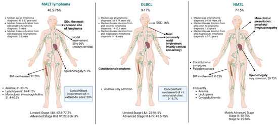 The different B-cell NHL subtypes arising in patients with underlying pSS display a distinct clinical picture. Though for the majority of the patients, lymphoma diagnosis follows pSS diagnosis [5,11,12,17,145], for a subset of patients, lymphoma diagnosis precedes pSS diagnosis [5,17]. Vasaitis et al. demonstrated in a cohort of 107 patients with pSS-related lymphoma that 17% of them had pre-existing lymphoma before pSS diagnosis and that the features discriminating them from pSS patients with lymphoma following pSS diagnosis were the male gender and lymph node enlargement [146]. In the following sections, we analyze the clinical features of the most frequently reported B-cell NHLs developing in the setting of pSS (summarized in Figure 3).