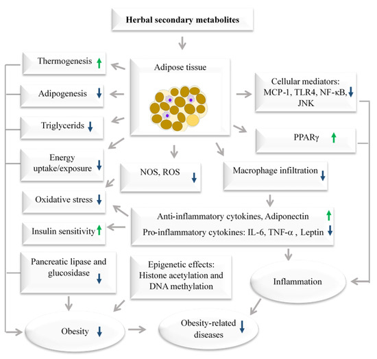At least 25% of the active compounds of modern pharmaceutic drugs were prepared from herbs. Disappointment with the relatively high costs and possible side effects of conventional pharmaceuticals have led to the currently perceived common use of herbal-based remedies. The health-promoting properties of black seeds, cumin, pomegranate, citrus fruits, rosemary, ginger, olive, turmeric, cinnamon, and the Mediterranean diet have been confirmed in cell culture test systems, animal test models as well as in clinical investigations [4,16]. Extracts and active compounds isolated from black seed, green tea, fenugreek, and garlic were shown to exhibit direct effects on adipose tissue [23,24,25].