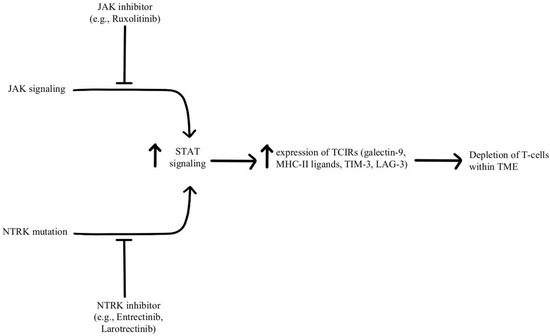 - Konen, J.M.; Rodriguez, B.L.; Fradette, J.J.; Gibson, L.; Davis, D.; Minelli, R.; Peoples, M.D.; Kovacs, J.; Carugo, A.; Bristow, C.; et al. Ntrk1 Promotes Resistance to PD-1 Checkpoint Blockade in Mesenchymal Kras/P53 Mutant Lung Cancer. Cancers 2019, 11, 462. [Google Scholar] [CrossRef]