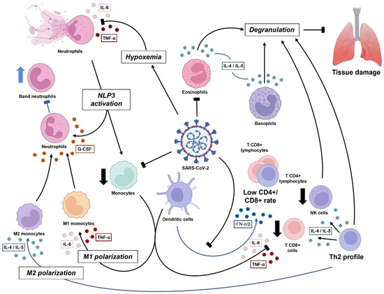 Dynamics of immune cell response against SARS-CoV-2 in acute phase. The virus induces pulmonary damage, which further causes hypoxemia. Both infection and tissue damage lead to inflammatory mediators, mainly interleukin-1β (IL-1β), CXCL8, and IL-6, which further cause NETosis and promote positive inflammatory feedback via inflammasome activation in both neutrophils and monocytes. Subsequently, critical patients experience low monocyte count, in terms of both T CD8+ and natural killer (NK) cells, with M1 polarization (driven by cytokine storm), all related to a worse clinical condition. Instead, when the antiviral stage is established, there is sustained type I interferon (IFN) by dendritic cells, contributing to the Th2 profile (IL-4 and IL-5), which induces the degranulation process by lymphocytes (CD8+ and NK), eosinophils, and basophils, and an M2 polarization, which results in a better prognosis. The release of granules has good and bad effects, whereby they can damage viral and human infected cells, but may also damage normal tissue, characterizing the respiratory syndrome. Macrophages produce granulocyte colony-stimulating factor (G-CSF), which acts in bone marrow to mature leukocyte progenitors. This may lead to a ‘shift to the left’ and improve viral response.