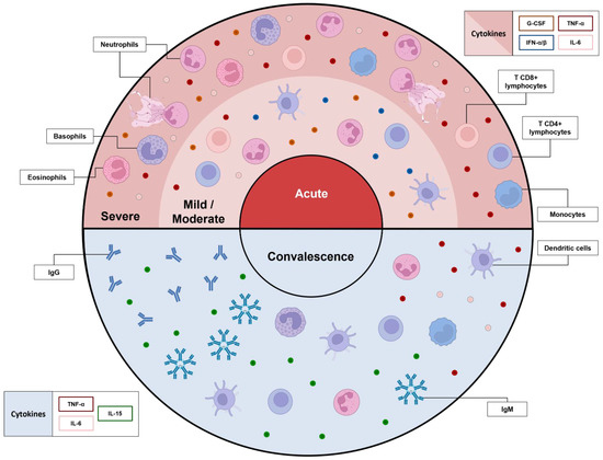 Although the participation of cells acts as a hallmark of disease progression and severity, neutrophils, lymphocytes, and eosinophils have been revealed as good predictors of clinical outcome in reaching convalescence. A remarkable ‘shift to the left’ is clear, which contributes to chemotaxis and impaired functionality in convalescence. Type I IFN and IL-15 are related to guide immunity, as well as thrombotic events, orchestrated by NETs and basophils.