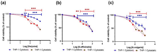 Displays the findings of the MTT experiment for the cytotoxic and cytostatic effects of THP-1-derived macrophages. Cells treated with various plant extract concentrations (1000 µg/mL–0 µg/mL (control): (a) Verjuice, (b) S. officinalis, and (c) A. vulgaris. Extract concentration expressed as Log [concentration] against normalized optical density with 100% set as the control value. Data represents the mean of three independent experiments conducted in triplicate. The asterisk indicates statistically significant difference from control cells which was calculated using a one-way ANOVA followed by Dunnett’s multiple comparisons test. (** p < 0.01 vs. LPS, and *** p < 0.001 vs. LPS).