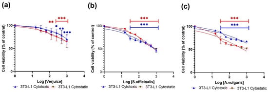 Shows the cytotoxic and cytostatic effects of various doses of plant extracts 1000 µg/mL–0 µg/mL (control) on 3T3L-1 cells. (a) Verjuice, (b) S. officinalis, and (c) A. vulgaris. Extract concentration expressed as Log [concentration] against normalized optical density with 100% set as the control value. Data represents the mean of three independent experiments conducted in triplicate. The asterisk indicates statistically significant difference from control cells which was calculated using a one-way ANOVA followed by Dunnett’s multiple comparisons test. (* p < 0.05 vs. LPS, ** p < 0.01 vs. LPS, and *** p < 0.001 vs. LPS).