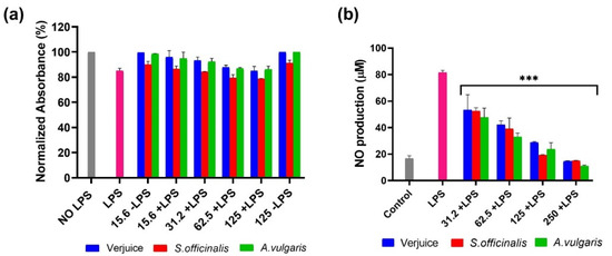 Shows the cell viability (a) and nitric oxide (NO) production by LPS-activated THP-1-derived macrophages (b) following a 72 h incubation with various plant extract concentrations (125 μg/mL–15.6 μg/mL). The asterisk indicates statistically significant difference from LPS-treated cells which was calculated using a one-way ANOVA followed by Dunnett’s multiple comparisons test. (*** p < 0.001 vs. LPS).