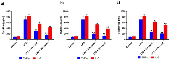 Effect of verjuice (a), S. officinalis (b), and A. Vulgaris (c) extracts (250 µg/mL and 125 µg/mL) on LPS-induced THP-1-derived macrophages on pro-inflammatory cytokines TNF-α and IL-6 production (pg/mL) after a 4 h and 6 h incubation, respectively, with two particular doses. Each bar represents the mean ± SD of three different experiments carried out in duplicate. The asterisk indicates statistically significant difference from LPS treated cells which was calculated using a one-way ANOVA followed by Dunnett’s multiple comparisons test. (* p < 0.05 vs. LPS, ** p < 0.01 vs. LPS).